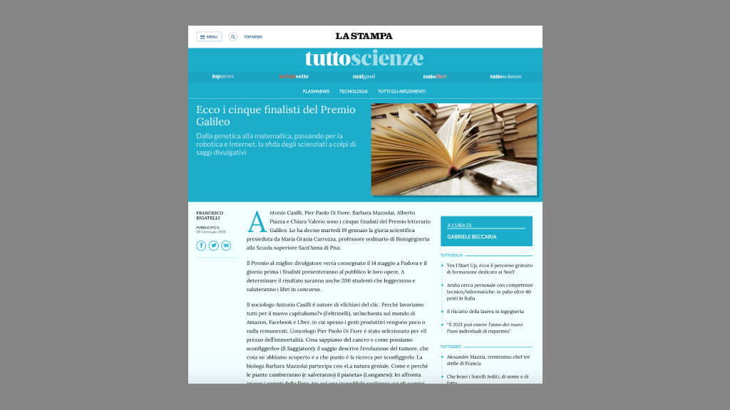 Il sociologo Antonio Casilli è autore di «Schiavi del clic. Perché lavoriamo tutti per il nuovo capitalismo?» (Feltrinelli), un’inchiesta sul mondo di Amazon, Facebook e Uber, in cui spesso i gesti produttivi vengono poco o nulla remunerati. L’oncologo Pier Paolo Di Fiore è stato selezionato per «Il prezzo dell’immortalità. Cosa sappiamo del cancro e come possiamo sconfiggerlo» (Il Saggiatore): il saggio descrive l’evoluzione del tumore, che cosa ne abbiamo scoperto e a che punto è la ricerca per sconfiggerlo. La biologa Barbara Mazzolai partecipa con «La natura geniale. Come e perché le piante cambieranno (e salveranno) il pianeta» (Longanesi): lei affronta invece i segreti della flora, tra cui una incredibile resilienza cui gli uomini potrebbero ispirarsi. Il genetista Alberto Piazza nella serie di saggi contenuta in «Genetica e destino. Riflessioni su identità, memoria ed evoluzione» (Codice Edizioni) racconta la più grande sfida medica ed etica che ci attende, sospesa tra il nostro passato di specie e i nostri futuri individuali. Infine Chiara Valerio con «La matematica è politica» (Einaudi) dimostra come la democrazia si basi sulla partecipazione, sulla verità e sulla soluzione di problemi pratici. La matematica è molto di più che un gioco di numeri e di formule.