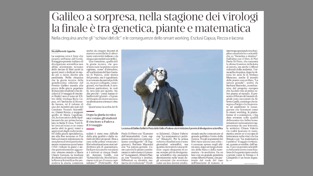 La sorpresa vera è forse che proprio nell’anno del Covid, il maggior premio italiano di divulgazione scientifica non abbia selezionato nessuno delle decine di libri usciti in questi mesi e dedicati in modo più o meno diretto alla pandemia. Nella cinquina che la giuria tecnica della quindicesima edizione del Premio Galileo manda alla prova della giuria popolare di duecento studenti (che deciderà il 14 maggio il vincitore finale) non ci sono né il libro della virologa Ilaria Capua, né l’inchiesta di Riccardo Iacona, né il volume di uno dei membri più noti del Comitato Tecnico Scientifico, Gianni Rezza, e neppure quello di Maria Capobianchi, la ricercatrice dello Spallanzani che per prima ha isolato in Italia il virus. Tutti libri (ma sul tema ce ne erano anche altri in gara) votati e apprezzati dagli undici membri della giuria specialistica, ma alla fine nessuno ce l’ha fatta ad essere selezionato in una platea di titoli particolarmente numerosa quest’anno (150 i volumi in gara) e anche particolarmente agguerrita: almeno stando a Maria Chiara Carozza, la studiosa di robotica ed ex ministro della Ricerca Scientifica che presiedeva la giuria, composta anche da cinquw docenti di materie scientifiche di altrettante università italiane e da cinque giornalisti scientifici. Una votazione, quella della giuria tecnica, che quest’anno non ha potuto essere ospitata, come d’abitudine, all’auditorium del San Gaetano di Padova, sede storica del premio, ma è ugualmente avvenuta davanti al pubblico, sia pure collegato, come i giurati, via Facebook. E un’edizione particolare, in realtà, non solo per questo. Anche perché – come hanno ribadito tutti i giurati – c’è grande bisogno di creare una nuova alleanza tra scienza e cittadini.