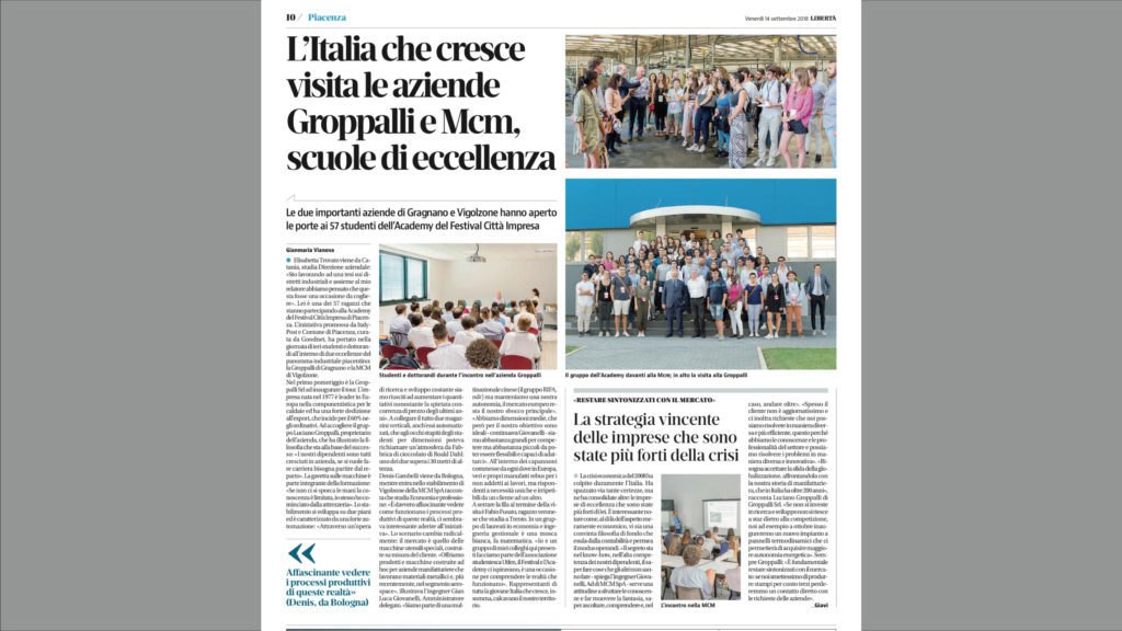 Elisabetta Trovato viene da Catania, studia Direzione aziendale: «Sto lavorando ad una tesi sui distretti industriali e assieme al mio relatore abbiamo pensato che questa fosse una occasione da cogliere». Lei è una dei 57 ragazzi che stanno partecipando alla Academy del Festival Città Impresa di Piacenza. L’iniziativa promossa da ItalyPost e Comune di Piacenza, curata da Goodnet, ha portato nella giornata di ieri studenti e dottorandi all’interno di due eccellenze del panorama industriale piacentino: la Groppalli di Gragnano e la MCM di Vigolzone. Nel primo pomeriggio è la Groppalli Srl ad inaugurare il tour.
