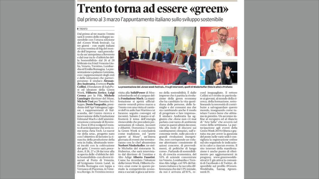 Parlando di sostenibilità, di crescita economica, del 53% di aziende concentrate tra Veneto, Lombardia e Trentino Alto Adige, col 70% del fatturato italiano e la raccolta differenziata che dal 13% iniziale, da noi è arrivata all’81%, record ineguagliato. Il rettore Collini si è rivolto in particolare ai giovani, al mondo della ricerca, della formazione, sottolineando la necessità di contribuire a salvaguardare questo mondo, insegnando come tutelare l’unico bene che abbiamo in prestito. Un accenno infine al recupero ed al rilancio di “Arte Sella” che avverrà nel corso della settimana. La partecipazione agli eventi della Green Week 2019 è libera e gratuita ma per avere la garanzia del posto nelle varie sedi è consigliata la registrazione online sul sito seguendo le indicazioni in calce a ciascun evento. Il sito internet della manifestazione è anche punto di riferimento per aggiornamenti in progress; www.greenweekfestival.it È già attiva la comunità di Facebook e di Twitter, disponibile sul profilo @GreenWeekItalia, hastag #greenweek19.