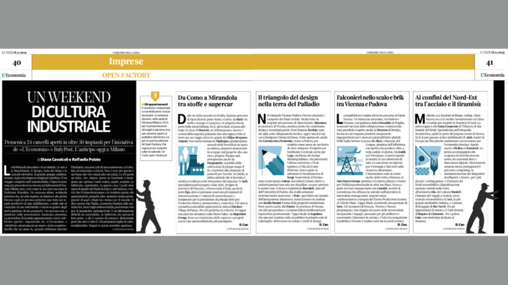 Le fabbriche, soprattutto, in questo caso. I posti dove nasce il meglio del Made in Italy e, tutt’intorno, i servizi che li fanno funzionare o le strutture grazie alle quali prodotti, progetti, idee, uomini e donne protagonisti di quel «Made in» volano per il mondo. Si dice spesso che l’Italia, economia fondata sulla manifattura, fuori dagli ambienti della produzione viva poi di pregiudizi antindustriali. È un’affermazione difficile da contraddire. Le fabbriche che aprono le loro porte, e chi è curioso di entrarci, dimostrano però che non è tutto lì. Chiamiamola voglia di cultura industriale. Magari ci si può costruire qualcosa.